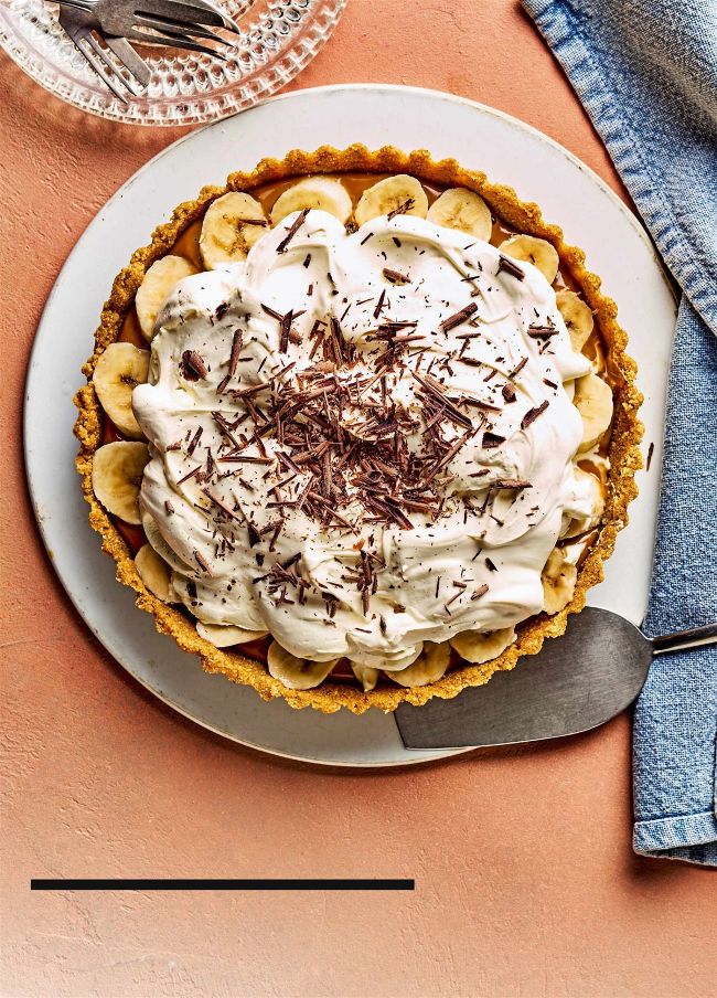 3 Whip the cream with the icing sugar until billowy and thick. Take the pie out of the fridge and spoon the whipped cream on top of the bananas. Grate over a square of dark chocolate, if you like, then serve.