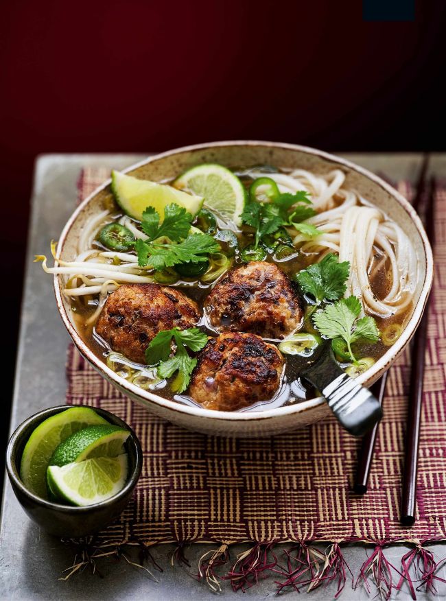 4 Meanwhile, cook the noodles following pack instructions. Drain well and divide between four bowls. Top with the meatballs and broth, removing the cinnamon and star anise. Scatter over the remaining spring onions, chilli and coriander leaves, and serve with lime wedges for squeezing over.
