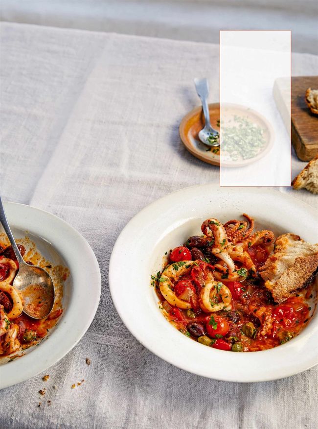 Squid is often flash-fried , but it’s also great when slow-cooked . Inspired by classic Italian puttanesca sauce, this dish makes a great hearty lunch.