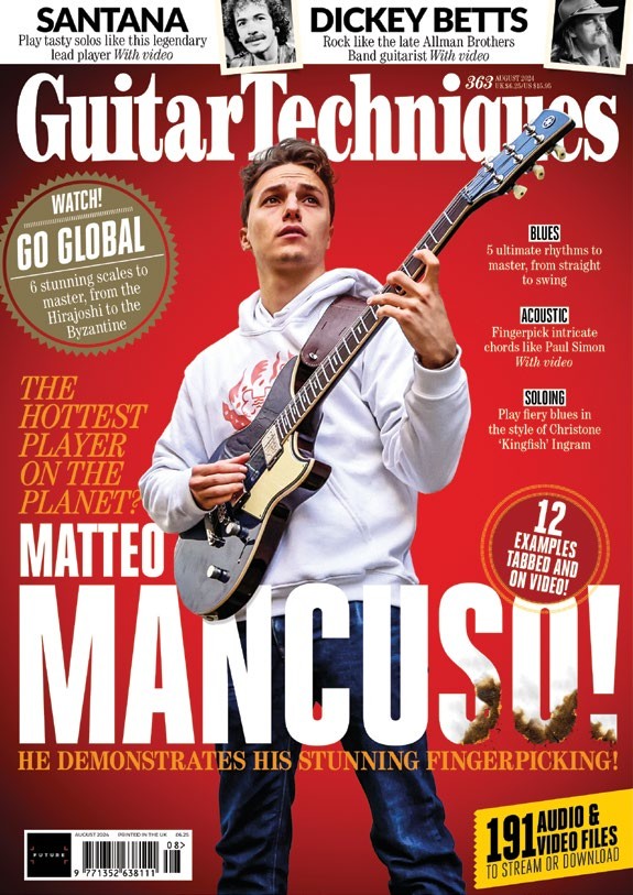 Twelve fingerpicked licks from the man himself. Watch, listen and learn from the Italian prodigy. Go Global; six scales from around the world. Plus: five blues rhythms; Santana, Dickey Betts, Christone Catfish Ingram, Paul Simon, Slayer.