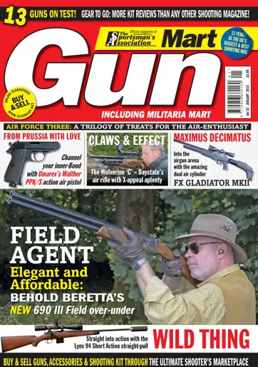 New Year - new guns! And we have lots in this issue including the fabulous Daystate Wolverine ‘C’ pre-charged air rifle and Beretta’s 690 III Field shotgun. Also on test are the Lynx Short Action rifle, the Savage Model 12 F/TR .308 Win rifle and the uniquely actioned SGC LR223 rifle, plus two 20g semi auto shotguns - the Bernardelli Mega and the Hatsan Escort ‘Muddy Girl’ – and the FX Gladiator and HW100KT Laminate model pre-charged pneumatic air rifles. As for historic guns there’s Pedersoli’s ‘Trapdoor’ Springfield cavalry carbine, a replica Walther PPK/S CO2 powered pistol, and finally airsoft versions of the Garand M1 carbine and the Russian Makarov pistol - enjoy!