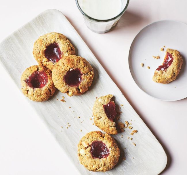 “Loved by kids and adults alike, these little breakfast cookies have an all-American flavour of peanut butter and strawberry jam. Enjoy warm.”