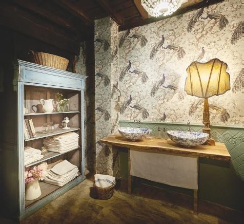One of the guest bathrooms, decorated with peacock wallpaper and with vintage hisand- hers sinks