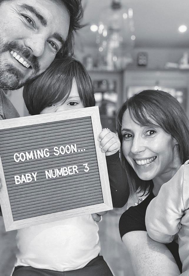 Son Teddy sneaks a look out as Alex, holding toddler Kit, and husband Charlie Thomson announce their baby news (above left),