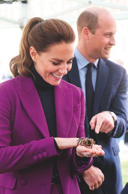 Kate gets up close and personal with a tarantula called Charlotte (below left), the same name as her daughter – who is a fan of spiders – and the couple raise a glass to their hosts as they join the students getting used to university life (below right)