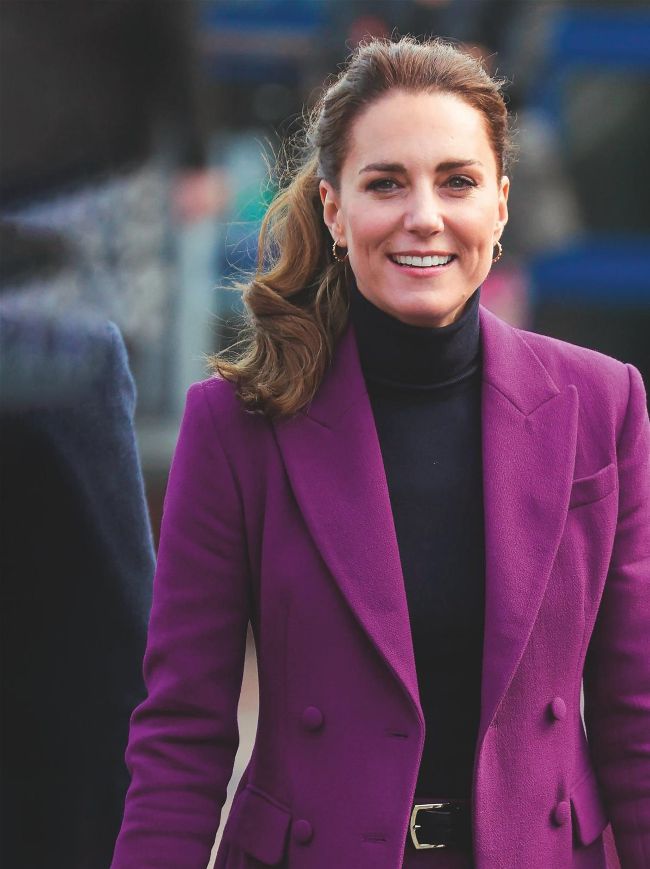 The Duchess adds a pop of colour to the day as she and the Duke meet staff and students at