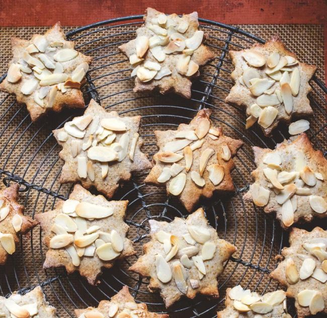 “These biscuits are traditional Advent sweet treats in both the Netherlands, where they are eaten around 6 December (St Nicholas Day), and in Germany, where they are eaten throughout the run-up to Christmas. Usually, almond spekulatius have a flaked almond base, but I’ve switched things up and adorned mine with them on top.”