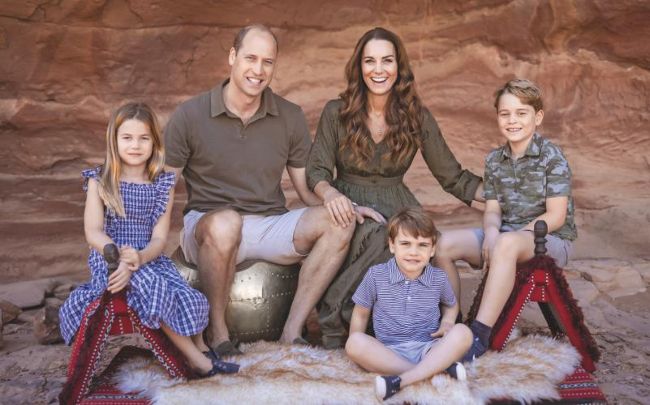 The Duke and Duchess of Cambridge’s 2021 Christmas card (above) shows Kate surrounded by her family, (from left) Princess Charlotte, Prince William, Prince Louis and Prince George against a rocky backdrop while on holiday in Jordan