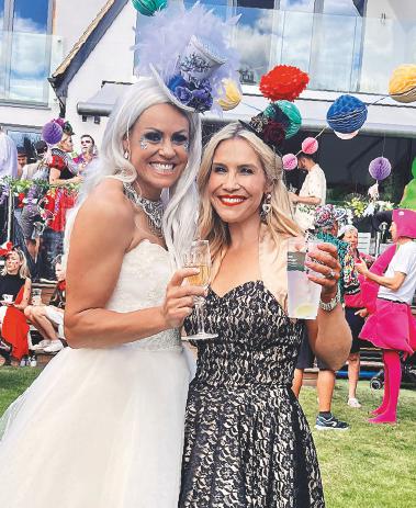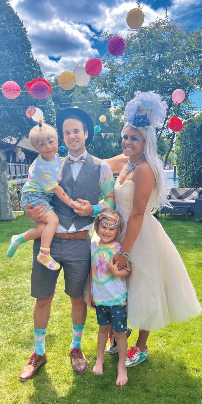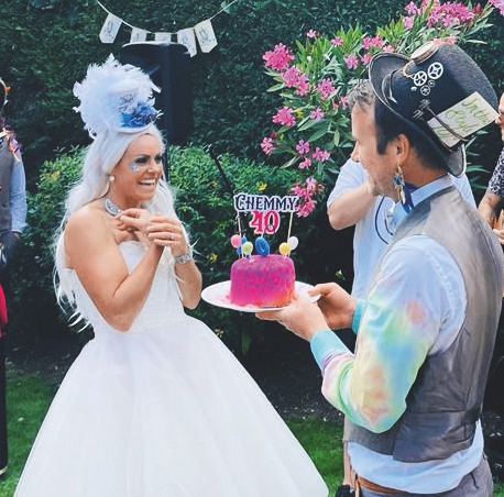 Eco-champion Chemmy recycles her wedding dress (above) to channel the White Queen in her Alice in Wonderland party, where husband Dougie surprises her with a special cake (left)