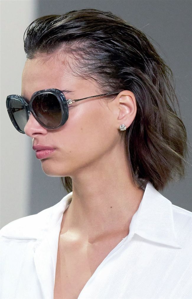Similar high-shine hair finishes have been cropping up for a couple of seasons now, but this dual-texture version at Badgley Mischka, where the mid-lengths and ends are dry, is much more wearable.