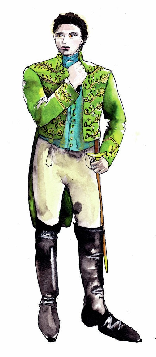 makes a dashing hero in Sandy’s green brocade jacket (left)