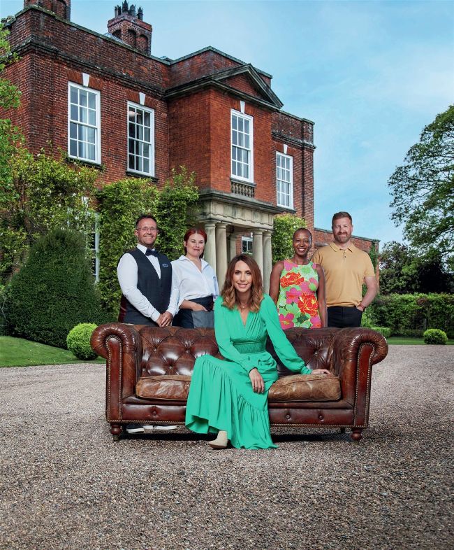 Alex with staff and guests on location for Reunion Hotel (also seen top). The new show reunites people who have made an impact on each other’s lives