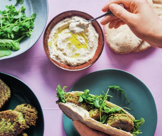 1. Put all the falafel ingredients and a generous grind of black pepper in a food processor; blitz until everything is combined and the mixture has come together into a ball. You can do this with a stick blender too, though you may need to add a splash of water to help the mixture start to blend.