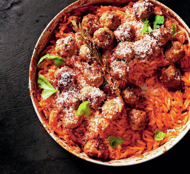 ONE-POT MEATBALLS WITH TOMATO SAUCE & ORZO