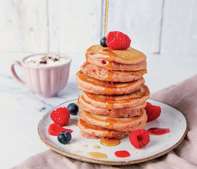 2. For the pancake batter, sift the flour, baking powder and salt into a large bowl. In a separate bowl or jug, whisk together the raspberry puree, maple syrup and eggs.