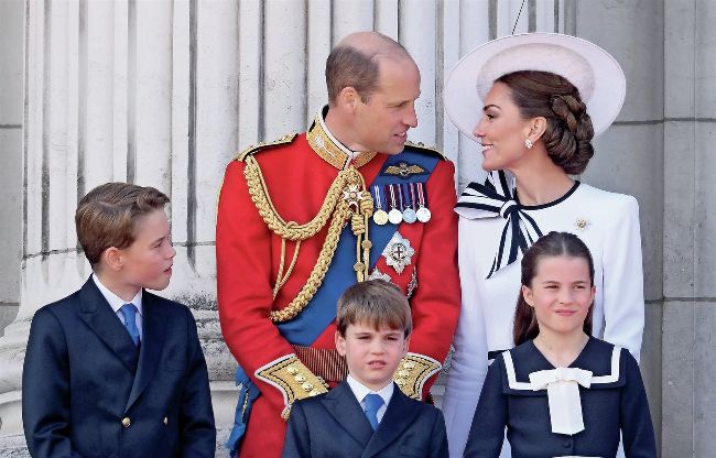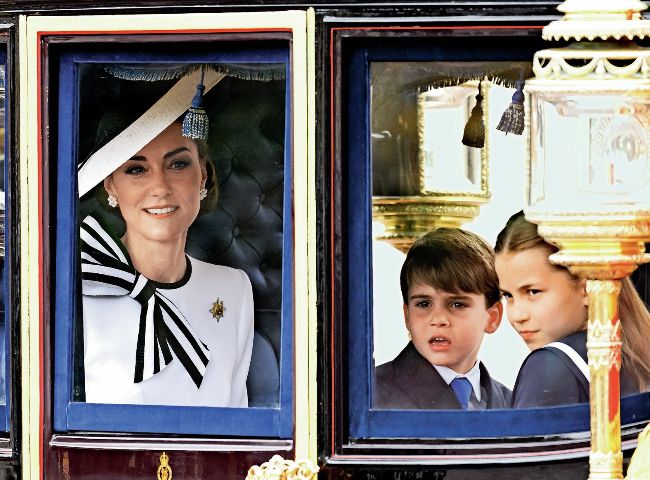 Kate, wearing Jenny Packham, enjoys Trooping the Colour with her husband the Prince and their children Princes George and Louis and Princess Charlotte;