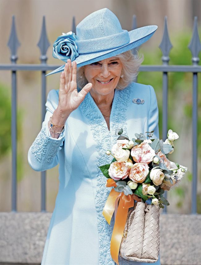The Queen, wearing a pale blue Fiona Clare dress with a matching wide-brimmed Philip Treacy hat and taupe suede pumps, led the way and smiled as she arrived at St George’s Chapel in Windsor Castle, where she and the King were joined by members of their extended family for the traditional Easter Matins service.
