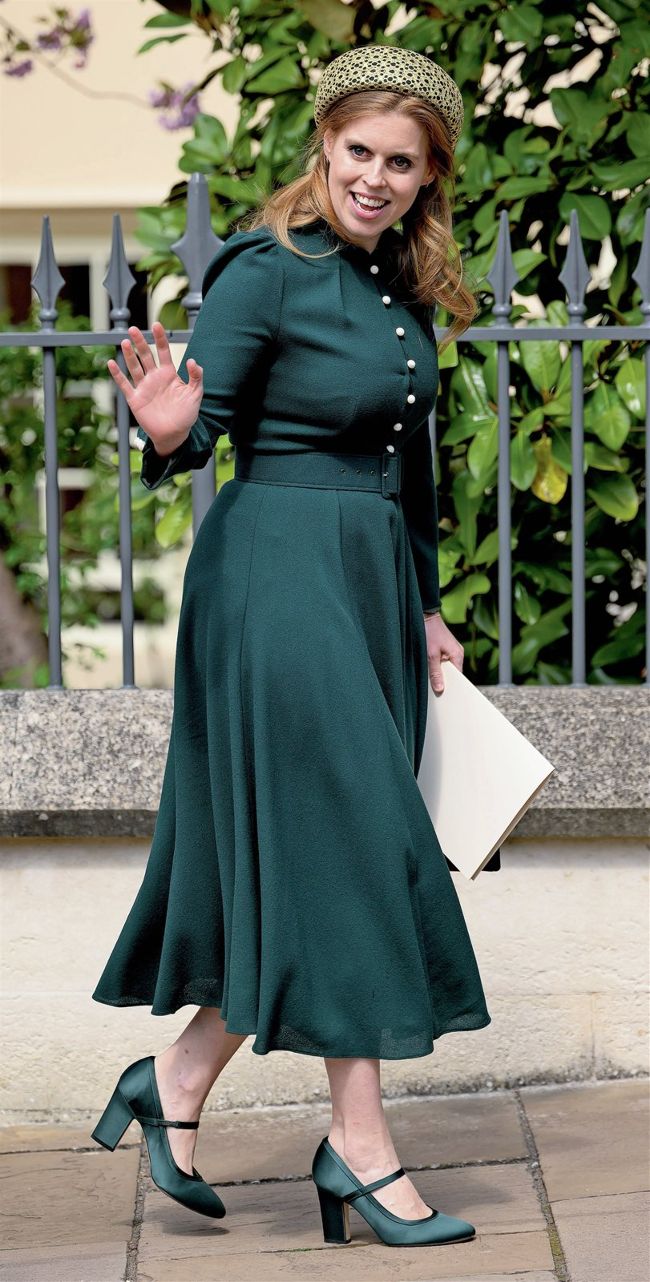 The Queen (left) wears Fiona Clare to the Easter service at St George’s Chapel in Windsor, while Princess Beatrice