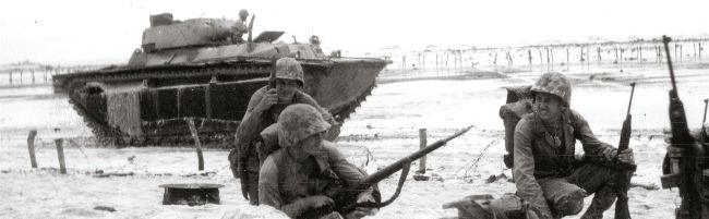 Marines cautiously move along a beach on Peleliu while covered by an amphibious tank