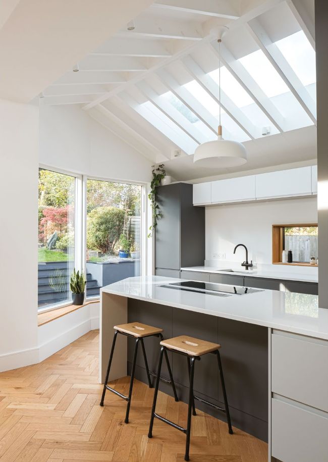 A dramatic extension with an eye-catching folded roof has revolutionised this Victorian flat in South London, transforming the once-gloomy ground floor into a contemporary, light-flooded space