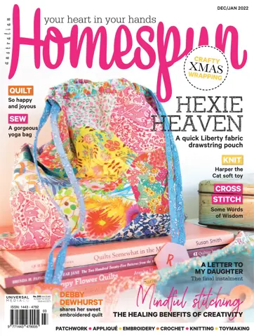 Homespun magazine is a place of inspiration, it combines creative techniques with a vast array of styles and themes taken from a team of leading craftspeople throughout Australia and the world. Homespun is a publication that is at the forefront of the industry, made by people who are passionate about craft. Each issue of the magazine features step-by-step easy-to-follow project ideas and accompanying patterns sheets, a variety of crafts including quilts to bags to dolls, inspirational photographs of fantastic finished products plus interesting reads to engage and entertain.