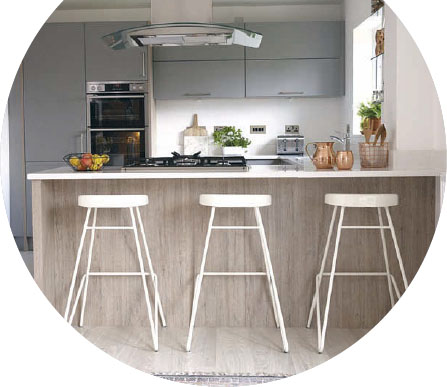 Claire has used stylish bar stools to create a casual dining area in the kitchen