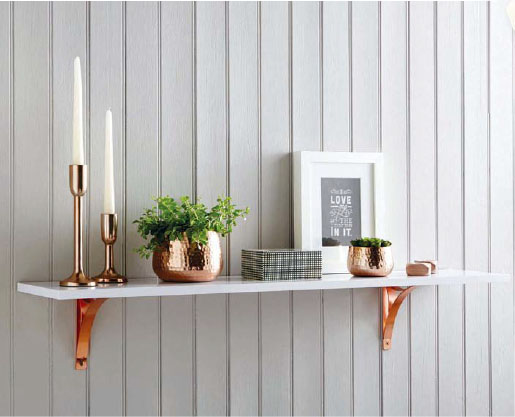 Copper trim Pep up your fixings with a hint of metallic – like these glossy brackets from B&Q