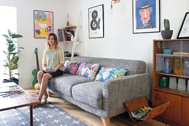 ‘I still can’t believe our sofa was £100 on Gumtree – it was nearly brand new! I love how well my Austrian tropical print fabric cushions go with it, too. The G Plan glass coffee table is also a strong favourite and adds to the eclectic mix of furniture.’