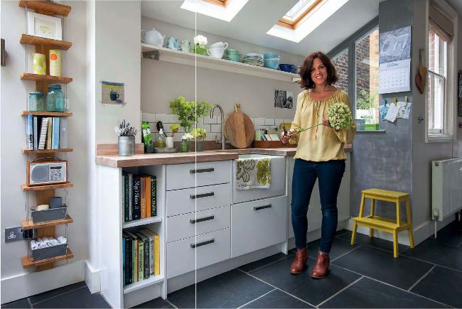 ‘The kitchen units, doors and handles were inexpensive ones from Howdens, and the oak worktop was from Norfolk Oak, which we later whitewashed in Danish white oil. As for the chalkboard wall, I didn’t want to have the traditional black colour, so after some Googling, I found that you could create your own chalkboard paint by mixing together emulsion and tile grout. I love the result – it’s really useful for reminders and shopping lists!’