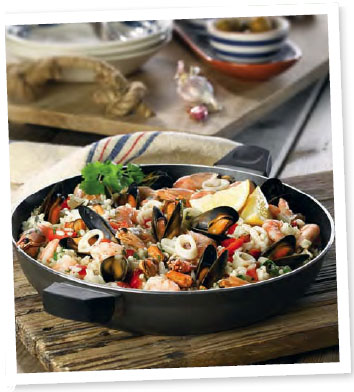 ✱ 1 tbsp olive oil ✱ 1 medium onion, finely chopped ✱ 1 clove garlic, crushed ✱ 1 red pepper, diced ✱ 350g Arborio risotto rice ✱ 100ml dry white wine✱ 1 litre hot vegetable stock ✱ black pepper to taste ✱ 225g pack seafood selection (squid, mussels and prawns) ✱ 125g whole cooked prawns with shells ✱ 10-12 fresh mussels, cleaned in cold water and beards removed (discard any that are not closed) ✱ 1 tbsp chopped fresh parsley ✱ 1 lemon, cut into wedges