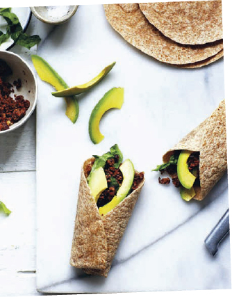 2 To assemble, warm the tortillas as instructed, then simply spread a spoon or two of the walnut and black bean mix around the tortilla. Top with slices of avocado and a generous handful of shredded romaine lettuce, then finish with a squeeze of lime juice and a sprinkle of salt and pepper.