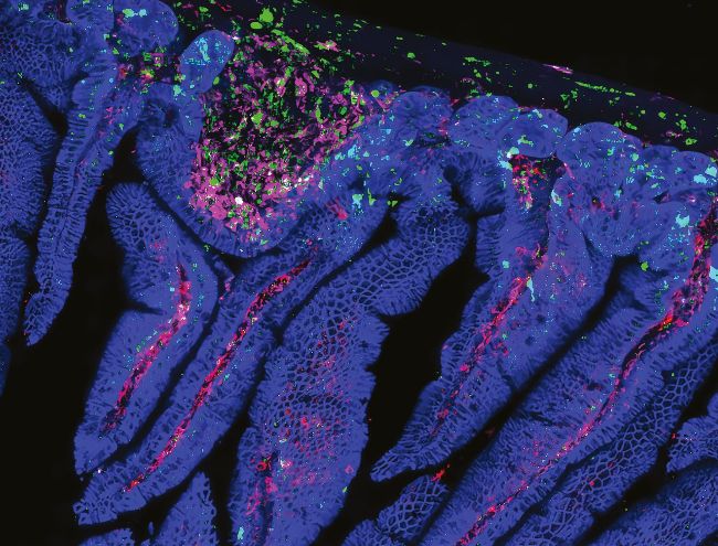 The small intestine is a tube-like organ forming a six-metre-long connection between the stomach and the large intestine, responsible for the absorption of nutrients such as carbohydrates and proteins. It’s lined with countless finger-like structures called villi, seen here in blue. Villi structures maximise the surface area of the small intestine and increase rapid absorption.