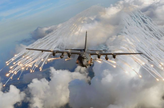 An American Air Force AC-13OU gunship can jettison decoy flares to evade enemy forces. When heat-seeking missiles are on the tail of gunships like this, a series of decoy flares are deployed. These are magnesium-filled tubes that burn much hotter than the jet engines of the gunship. Aircraft launch these flares to throw the missiles off their tail, allowing planes to escape.