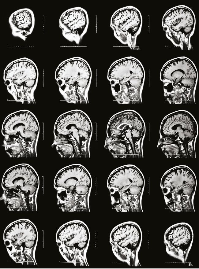 Using magnetic resonance imaging (MRI), doctors can take a peek inside our heads. In this series of MRI scans, image slices have been taken vertically from one side of the head to the other, revealing all the cerebral structures in the brain. To capture these, powerful magnetic fields excite atoms in the body, then radio waves are used to detect their movements and convert that information into signals that a computer interprets as an image.