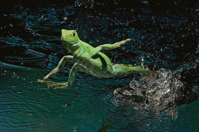 Meet the common basilisk, also known as the Jesus Christ lizard due to its ability to run on water. These reptiles rapidly move their hind legs, which act as paddles on the water. Their rear feet have long toes that allow their skin to flatten as they make contact with the water. This skin increases their surface area on the water, so as long as they are running fast, it prevents them from sinking.