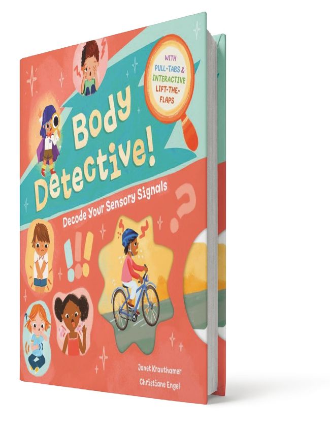 bodies communicate their needs to us. To use a simple example from the opening pages: “My tummy is making funny noises… my body signals tell me that I am feeling hungry!” It continues in this vein, describing a spectrum of biological and emotional signals that include anxiety, tiredness, pain, the need to urinate and others. It’s appended by a detailed description of what ‘interoception’ is – a sixth-sense awareness of the signals from your own body – before asking the reader to focus on various parts of their body to gauge any sensation coming from it, however big or small that feeling may be. Author Janet Krauthamer’s words are complemented by Christiane Engel’s appropriately childish, fun illustrations, with paper flaps and panels that flip up or slide across to reveal words and pictures. The whole package is pithy, yet is very effective at communicating its message on several levels.