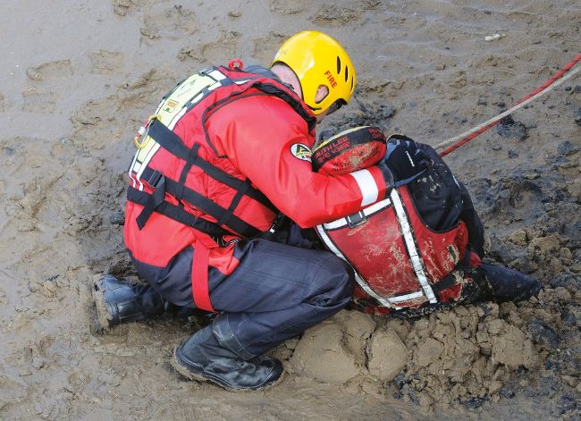 Firefighters inject quicksand pits with high-pressure water to loosen sediment and pull people free