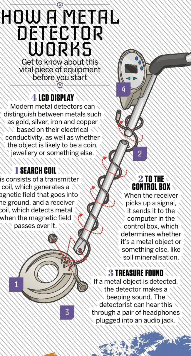 1 SEARCH COILThis consists of a transmitter coil, which generates a magnetic field that goes into the ground, and a receiver coil, which detects metal when the magnetic field passes over it.