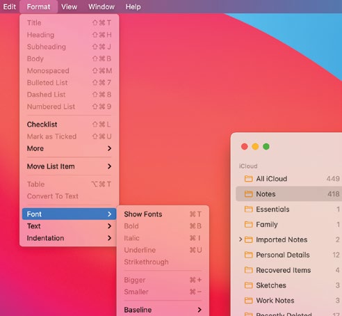 While in the Notes app, click on Format>Fonts and you will see the ‘Show Colours’ option – select this. You can also press the cmd+shift+C keyboard shortcut to instantly access this feature.