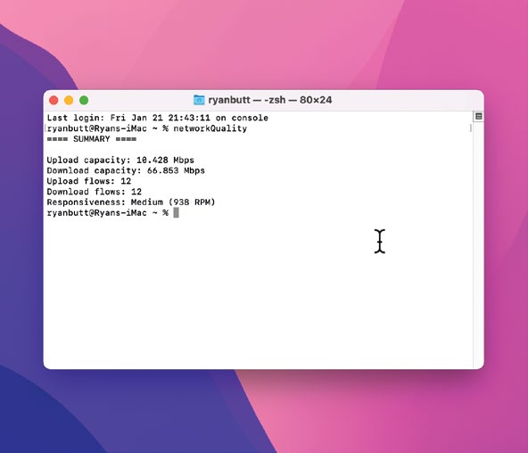 If your internet connection seems dodgy or you need to relay the strength of your signal, then you can do so within macOS Monterey by using the Terminal app. Open a new Terminal window and type networkQuality into the command prompt. After a few seconds you’ll be shown upload/ download speeds, as well as a few other stats that may be useful.