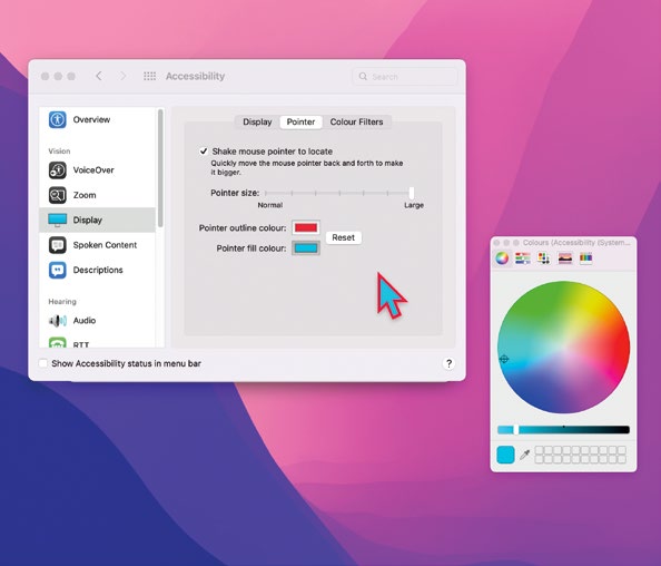 Bored of your usual black and white pointer? Why not switch it up to pretty much any colour combination you can imagine? Head to System Preferences> Accessibility>Display and click on the ‘Pointer’ tab. Now, click on the ‘Pointer outline colour’ and ‘Pointer fill colour’ options and then use the colour wheel to pick your shades.