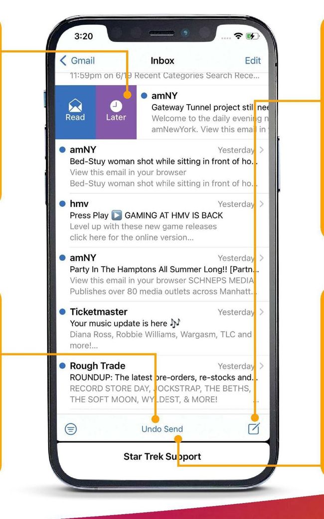 After composing an email, you may not want to send it immediately. Long-press on the Send button to bring up a menu of scheduling options. These include ‘Send Now’, ‘Send 9:00 Tonight’ and ‘Send Later’ – which lets you schedule an exact time and date to send the email.