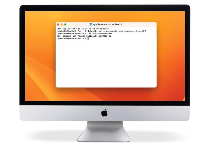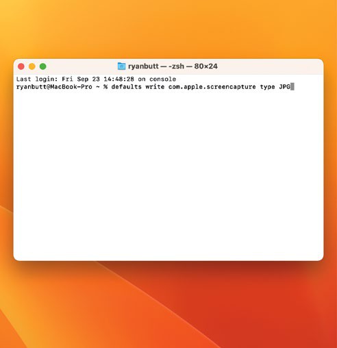Launch the macOS Terminal app and then enter: defaults write com.apple. screencapture type JPG and then hit enter. You may need to restart to initiate changes.