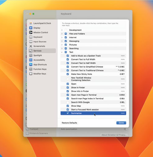 Go to System Settings> Keyboard>Keyboard Shortcuts and then select ‘Services’ in the sidebar. Click the arrow next to ‘Text’ and then tick the ‘Summarise’ option.