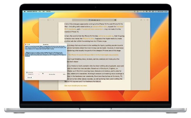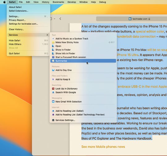 Now, in any app where there is text, such as a Safari news story in this case, highlight some text, and then go to Safari>Services> Summarise. The highlighted text will appear in a separate window.