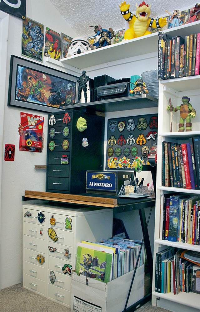 I feel like I have always been creatively allergic to blank walls. I want my workspace to be full of energy and visual chaos. This way, I can lean back in my chair and stare at my favourite comic book covers. I can grab one of my many statues and set it next to me while I work. I have all my favourite books within arm’s reach. It’s the perfect place for me to do my best work.