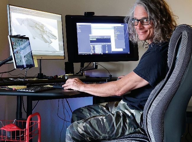 I work digitally, so I’ve got a few setups for my needs or circumstances. I have a big Threadripper-based tower with three RTX cards running a 22-inch Cintiq and monitor. I also have a thin yet beefy 15-inch MSI Creator laptop that runs a 13-inch Cintiq as a second monitor. I’ve run three monitors with that thing, and it’s impressive. I can run VR from either system, and can go mobile at the drop of a hat. I’m happy to have and use both. I keep a Microsoft Surface Pro around for reference images, internet browsing, Pinterest, and some MoI (Moment of Inspiration) modelling wherever I go. My desk is a split-level Biomorph and my chair is a cheap office chair from OfficeMax with a lumbar pad. I use Contour Design mice when I can and a basic keyboard.