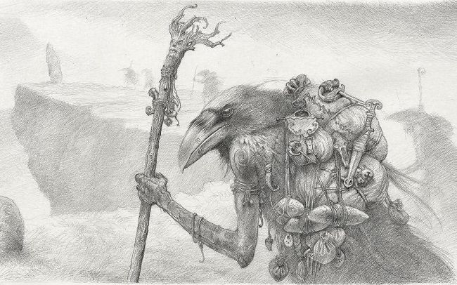 RAVVEN JOURNEYING “A ravven wanderer reaching the Edge of the World. A pencil drawing for The Kingdom of Brass.”