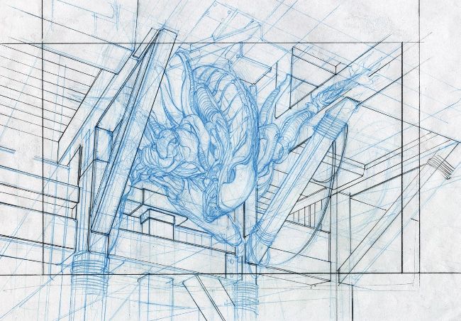 ALIEN III SKETCH (1990) A rough blueline pencil layout sketch for a production painting. This piece was created to help bring the project to Industrial Light & Magic (ILM).