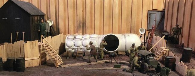Construction of a model would involve some compromises, not least in terms of the overall proportions of the finished piece, but that was something I felt I could live with. The actual scale of the thing was something of a given as I wanted to include a number of figures, bits of machinery and so on, so the standard 1:35 was an obvious choice as that would give me a wide selection of military stuff from which to choose. What wasn’t available in that scale was a Martian spacecraft, so that was going to need some construction from scratch. The main hull was octagonal in cross-section so it would be relatively easy to make from flat sections of plastic card, but that left the domed nose section (assuming that’s what it is) and the circular entrance hatch. Arming myself with a 1:35 scale military figure I made searching for suitably sized items part of my weekly shopping ritual.
